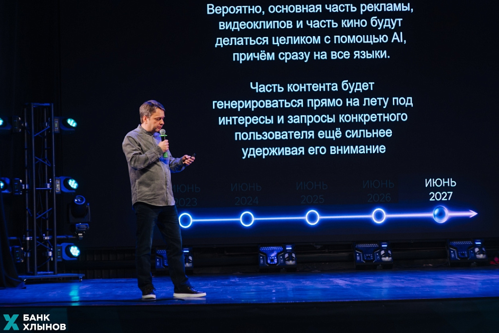 Илья Прозоров: Друзья! Рад приветствовать вас на Хлынов БизнесФесте — месте, где каждый из вас может открыть для себя новые возможности, найти вдохновение и получить мощный импульс для движения вперед. Сегодня мы собираемся под лозунгом «Создаем будущее вместе: тренды цифровой эпохи для бизнеса». Искусственный интеллект, большие данные, финтех-решения — все это не просто слова, а конкретные инструменты, которые уже завтра определят лидерство компаний на рынке. История банка Хлынов — живое подтверждение такой «антихрупкости». Мы знаем цену ошибкам и вкус побед, умеем превращать вызовы в возможности и инвестируем в скорость реакции, а не в иллюзию стабильности.